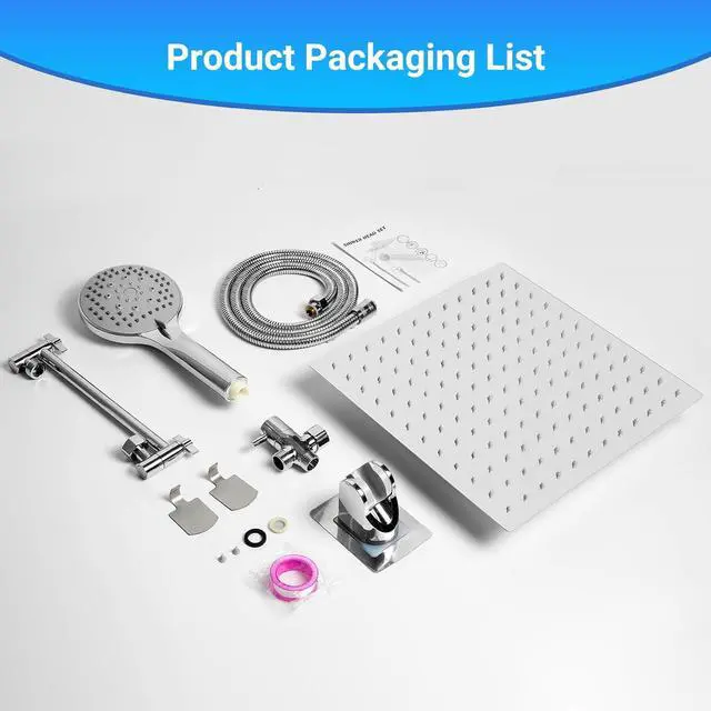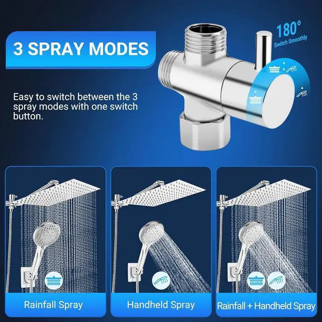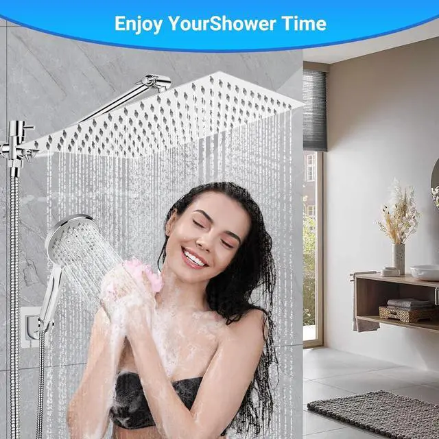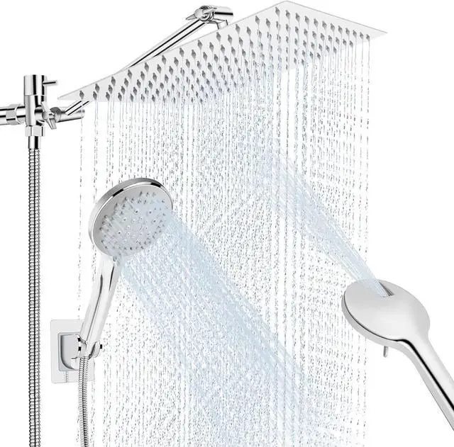 SHOWER HEADS WITH HANDHELD SPRAY COMBO: 10" Large Square Rainfall Showerhead, chrome face 5 spray settings handheld shower, 5ft stainless steel hose, 3-way diverter, strong suction cup shower bracket, Teflon tape, washers, installation manual.
