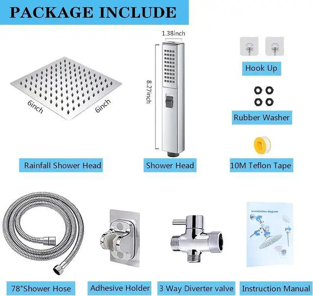 PACKGE INCLUDED6'' Rainfall square shower head & handheld shower head with holder, water flow regulator, 78'' shower hose, Adhesive Shower Head Holder, teflon tape, shower hook and user instruction. We stand by our shower heads with our outstanding customer service, if you ever have a problem, don't hesitate to contact us.