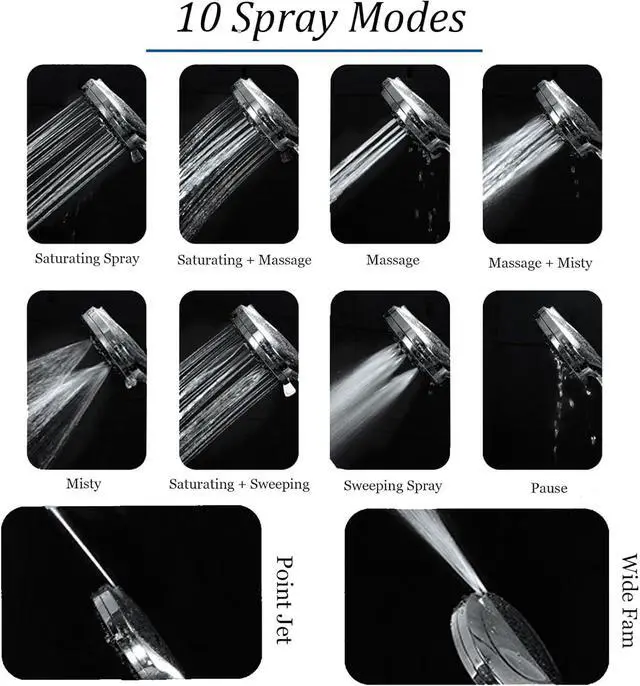 INNOVATIVE 10 SPRAY MODESTired of the nasty soap residue and dry hair you leave behind after every shower? Now you can clean it from six feet away in a matter of seconds via POINT JET Mode without having to set a foot in your shower. The handheld shower head also has 9 other spray settings giving you a high-pressure comfortable and relaxing bathing experience.
