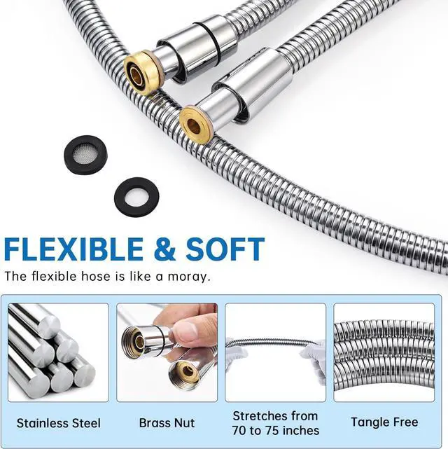 STAINLESS STEEL METAL 71 INCH LONG HOSE: A flexible hose Keeps you away from winding or tangling. It can be stretched from 70 to 75, which will bring you more convenient. With the powerful wash mode, you can clean the toilet, bathtub, and even every corner of the bathroom at any time.