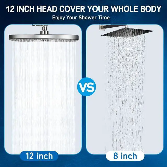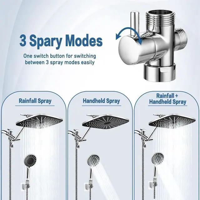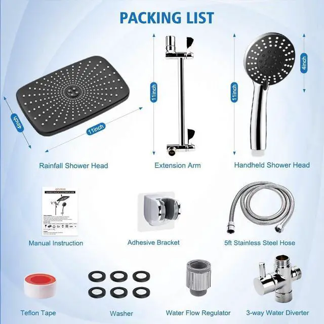 Wide Shower Head Combo: It comes 12 wider square rainfall showerhead, 4.5 '' chrome face, 6 spray settings handheld shower, 5ft stainless steel hose, water flow regulator, 3-way diverter, strong suction cup shower bracket, Teflon tape, washers, installation manual and warranty. (NOTE: Please put the hose on backward if the shower head handle doesn't fit in the holder!!