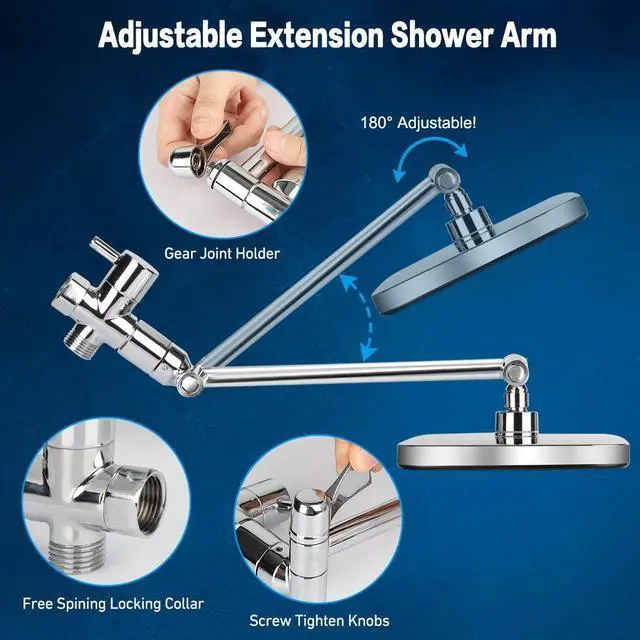 11" Adjustable Extension Arm: 11" Adjustable extension shower arm fits any shower head or hand shower. Made from solid and brass. Do not worry about breaking or leaking. Allows you to adjust the showerhead for awesome angle and height. 2-Foot vertical movement range makes it easy to tighten the joint