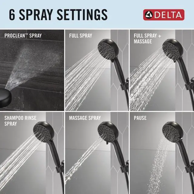 6 POWERFUL SPRAY OPTIONS: The Delta shower head with handheld comes with ProClean Spray, Full Spray, Full Spray + Massage, Massage Spray, Shampoo Rinsing Spray and Pause
