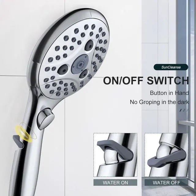 WATER SAVING ON/OFF PAUSE SWITCH: After a long term of researching and developing, SunCleanse shower head create an advanced internal flow blocking technology. Waterflow can be instantly cut off by flipping switch, instead of groping for shower faucet while showering.