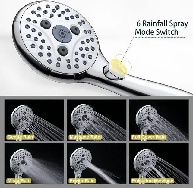 6-Mode Shower Spray: Rainfall, rainfall spray, rainfall trickel, power spray, power massage and water saver trickel, which satisfy different requirements. It's always convenient to have a spray-mode switch in your hand.