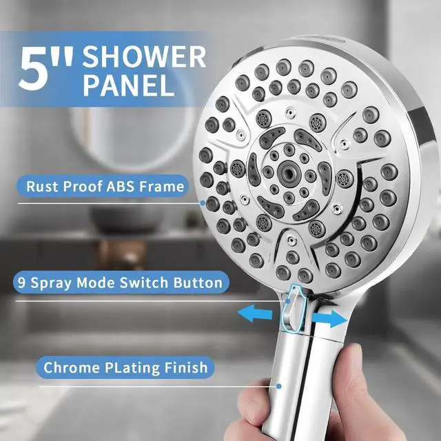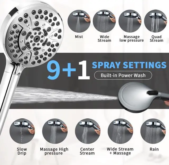 Innovative 9+1 ModesOur product features 9 different spray modes, including mist, wide flow, low-pressure massage, four-flow, high-pressure massage, central flow, rain, and more, meeting various needs. Additionally, it comes with a built-in high-pressure spray function.