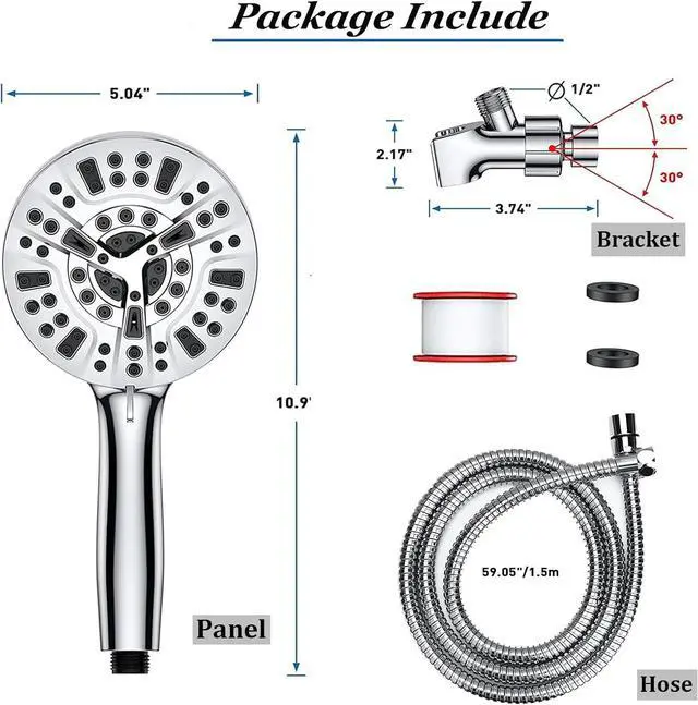 SUPERIOR MATERIAL & 5.04" Big Panel The TIVMIK hand shower is made of high-quality ABS material with a chrome finish. The refined chrome finish makes it lightweight, durable, rust-resistant, and fade-resistant. The flexibility of the Brass adjustable bracket makes every shower comfortable and convenient. 59.1" stainless steel hose & 5.04" large shower panel bring you a better shower experience.