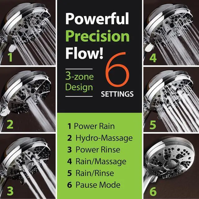 Deluxe 6 setting hand shower: Can be used as Overhead or Handheld shower, High-power Click Lever Dial, Ergonomic Grip Handle, Rub-Clean Jets for easy cleaning and preventing lime buildup, all chrome finish including face.