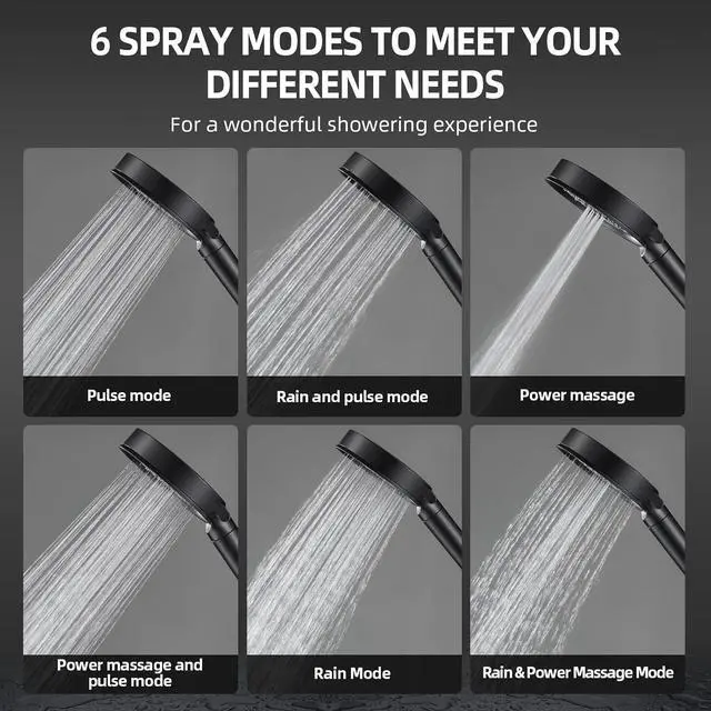 6-Spray FunctionsThis handheld shower has 6 selectable modes, and when you rotate the handle on the shower panel, you can easily switch between the different modes you want. The interesting combination of various modes can help you eliminate the fatigue of the day.
