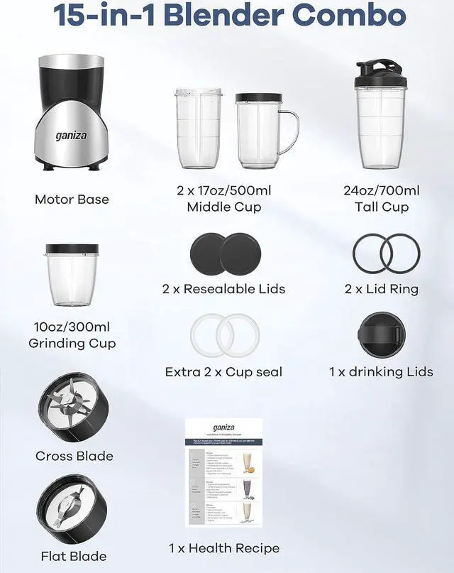 Blender and Grinder Combo for KitchenGaniza Countertop Blender comes with a stainless steel 6-blades, it makes your smoothies, shakes, protein drinks, frozen drinks in seconds. Easy to get nutrients and vitamin extracts hidden in fruits and veggies. The powerful string flat blades use cyclonic action to break down tough ingredients, perfect for nuts, spices, coffee beans.