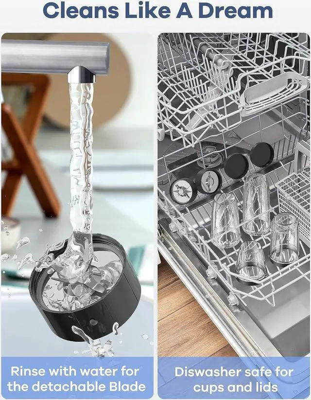 Detachable 304 Stainless BladesThe upgraded 6-leaf cross and 2-leaf flat blades allows the smoothie maker & grinder to blend and extract nutrients easily. Detachable blades are easy to clean. Cups and lids are dishwasher-safe.