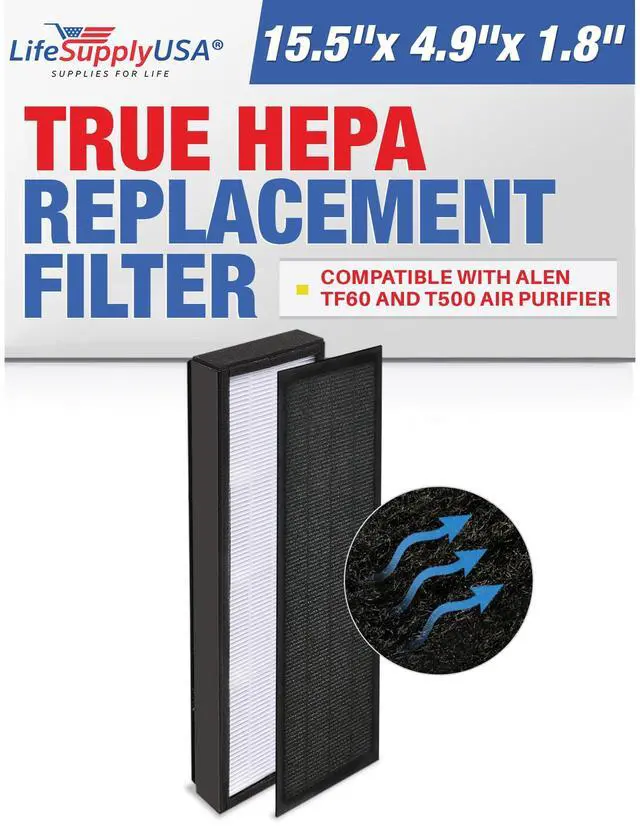 GREAT VALUE: This is a replacement filter for air purifiers, to help effectively filter airborne particles for healthier living. Each filter includes 1 LifeSupplyUSA True HEPA Filter Replacement Compatible with Alen TF60 and T500 Air Purifier. Approximate dimensions are: 15.35" x 4.69" x 1.38" inches