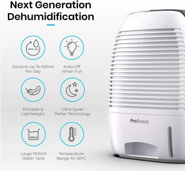 PER DAY: Only effectively works ABOVE 15°C. Features a 1500ml water tank and next-generation Peltier Technology capable of removing up to 500ml of water per day. The ideal dehumidifiers for basement and rooms up to 3000 cubic feet (250 sq ft).
