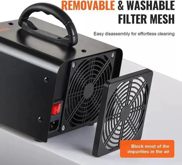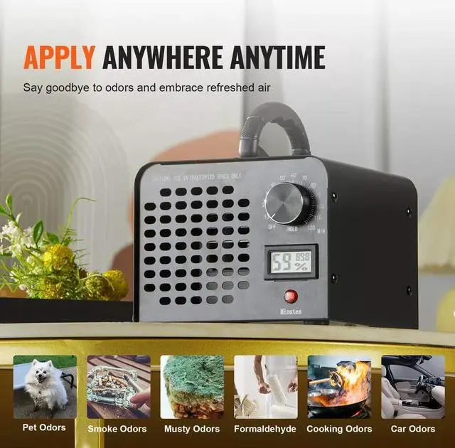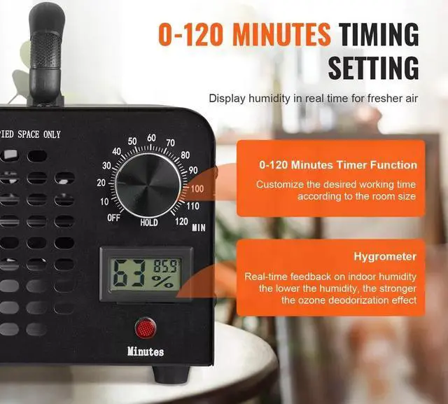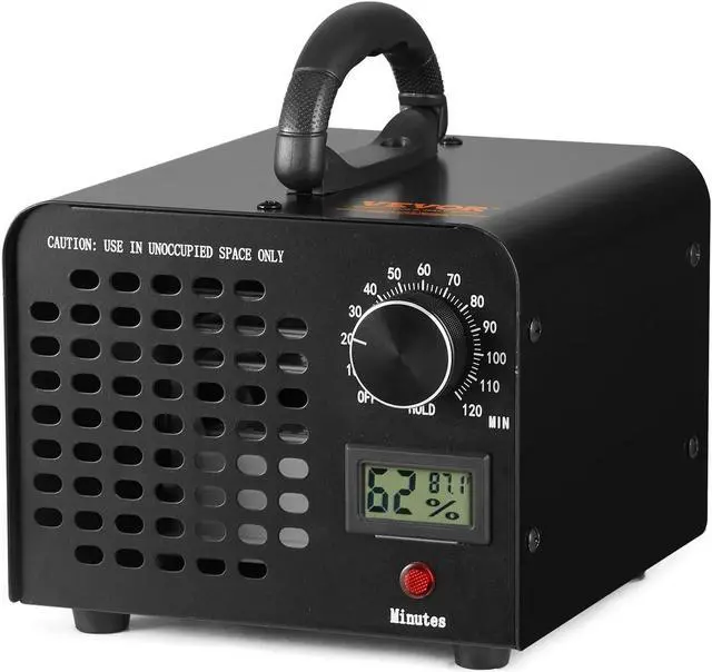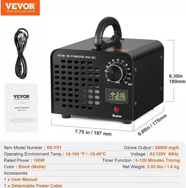 1. With 24, 000mg/h powerful max ozone output and 3, 230 square feet coverage area, VEVOR ozone generator prioritizes your health by effectively eliminating odors, smoke, and pollutants from air. It features humidity display and 0-120 minute timer, ensuring indoor environment is constantly monitored.
