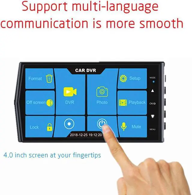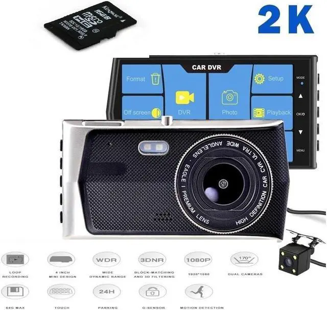 1080P FHD Dual Lens and Touchscreen? Full 1920*1080P HD video recording at a smooth 30 FPS with 640*480P rear camera and touch screen easy to operate and set, which capture both front and rear view of high quality at the same time, double assure your safety Clear 4inch IPS screen and 170 wide-angle lens Due to the big and nice sized screen, it is easier and convenient for us access to options screen, playback videos on dashcam. It's a positive feature as you can see what's happening in front and back of the car at the same time when driving Powerful Functions, G-Sensor (Gravity Sensor), Loop Recording, Motion Detection, Night Vision, Parking Monitor, and HDR, these powerful features keep you and your car's safety and bring you a wonderful driving experience as the best companion in your driving journey Easy Installation and Superb for Rear Parking Connect the red wire from the rear camera to the reversing light lamp, when the car was in reverse, the image of a rear camera will automatically switch over the full screen on the front camera *Safe service Package including front dashcam, a rearview camera, Rear connect the cable, car charger, suction cup mount
