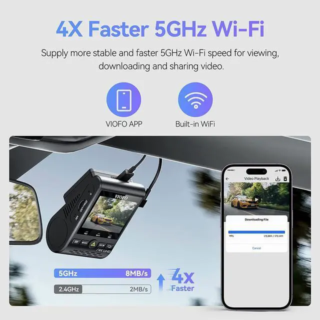 Wireless Wi-Fi & GPS 5GHz & 2.4GH z dual-band Wi-Fi could transmit in two different standard frequency ranges to avoid wireless interference. More stable signal and faster speed. With GPS logger, dash camera can log the current speed and GPS location, Timestamp information can be embedded in the video. Real-time speed would display on car camera screen in KM/H or MP/H.