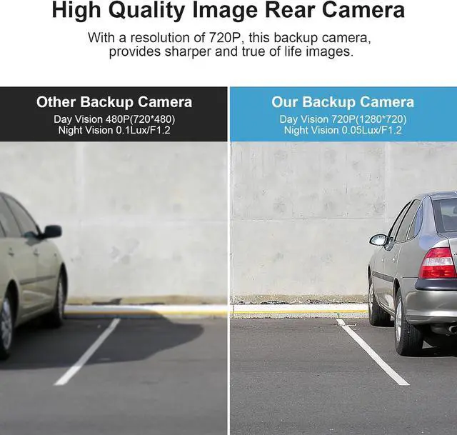 HD 720P Image QualityOur car backup camera is designed with an upgraded 1/3-inch color CCD image sensor, and will give you a true high quality 720p (1280x720) image. It has starlight level night vision ( 0.05L ux, excellent low-light performance), you never worry about parking during night, rainy day or in dark garage.