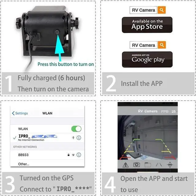 Use Your Phone/Tablet MonitorWiFi Magnetic Hitch Backup Camera comes with the 'RV Camera' phone app. Use your iPhone iPad Android cellphone smartphone tablet to connect its Wi-Fi, you can see what's happening behind your vehicle on the app. No monitor on dash any more.