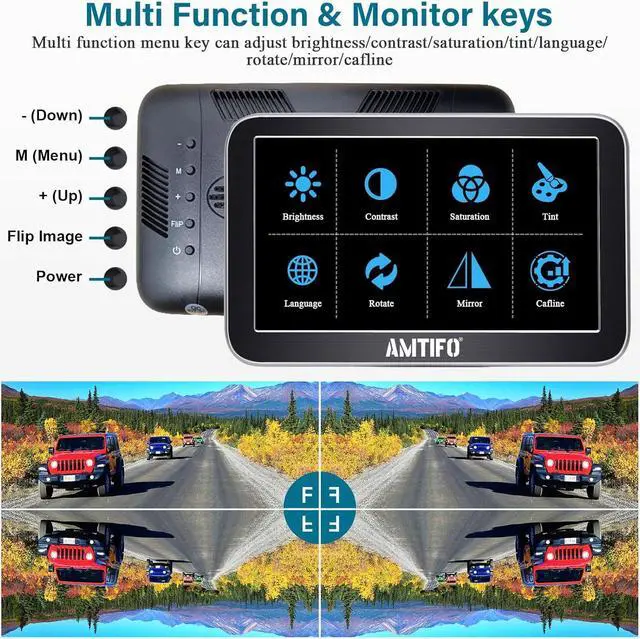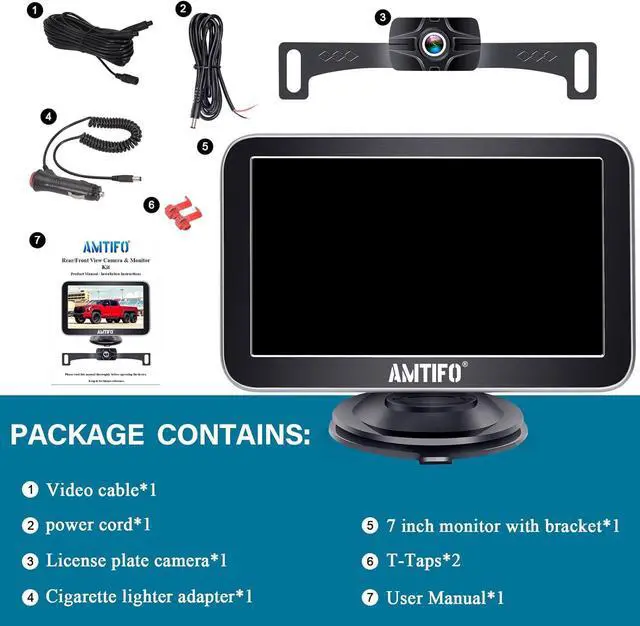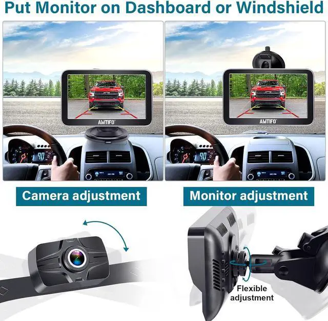 MULTI-FUNCTION MONITOR Perfect display size to see details without blocking your view. This car backup camera with monitor allows you to easily switch between front and rear views on a large 7-inch monitor with adjustable brightness, contrast, saturation, hue and language for a perfect viewing experience. Offers multiple options for mounting, dashboard or windshield mounting.