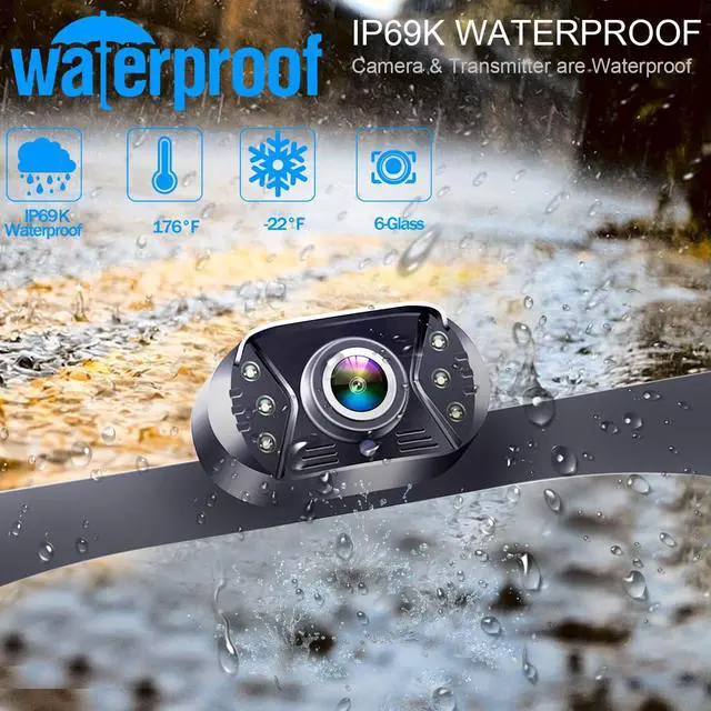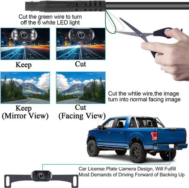Perfect Viewing Angle & Waterproof Rate: Adjustable reverse camera vertical view angle, showing non deformable images by 150° perfect gold viewing angle. IP69 waterproof back up camera secures your driving safety no matter what the weather like. And with 6 LED lights enhance night vision capability.