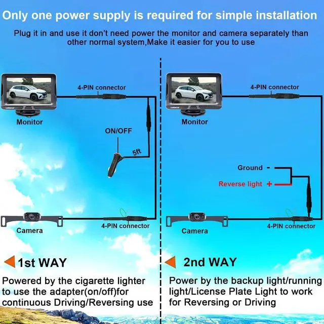 Plug and Play: License plate backup camera can be powered by connecting to reverse lights for use when vehicle is in reverse gear. Or can be powered by directly connecting to a 12v source fuse box or cigarette lighter/power point/ignition switch for continuous use.