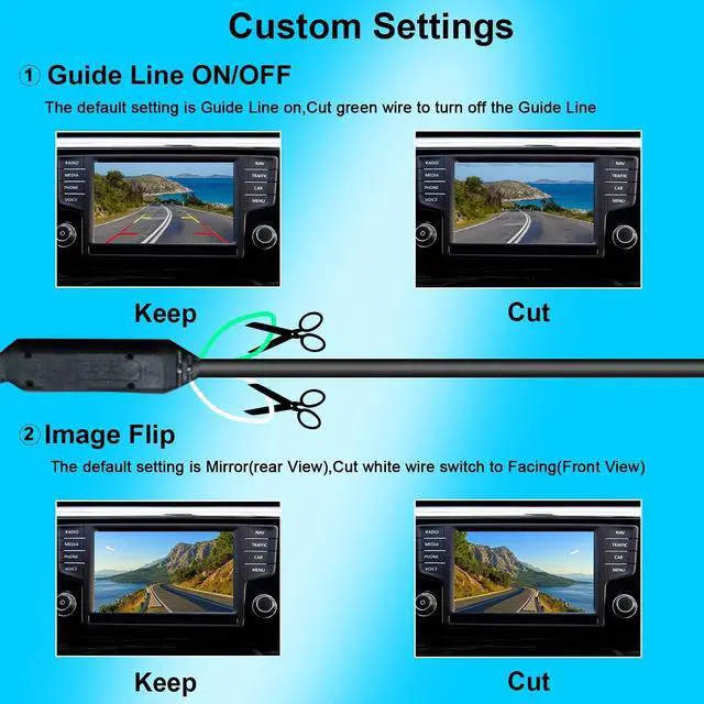 Guide Lines ON/OFF& Front/Rear ViewBackup Camera with green and white wire. Cut the green wire to parking assistance guild line disappear. Cut the white wire swith Rear (mirrored) image to Facing (front) View. (You can check the product pictures)