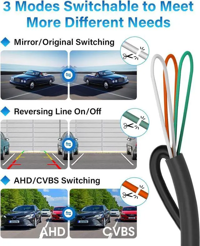 3 control modesThe backup camera breaking through the traditional rear camera single AHD/CVBS signal output limitations, without complex settings can be easily achieved AHD/CVBS (Default AHD 1080P 25 FPS), mirror/original image, so it can used as front camera/side camera, display/non-display guideline of the three control modes of switching, a complete solution to the compatibility problem, broader selectivity, can be applied to more scenarios.