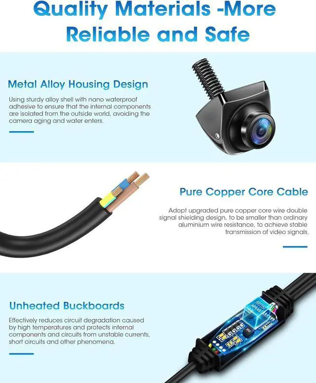 High Quality MaterialThe backup camera adopts a non-heating buck board to reduce the line aging caused by high temperature, protect the internal components and lines, prevent unstable current, short circuit and other phenomena. Also, back up cameras for cars adopts pure copper core cable, avoid the effects of high resistance and poor signal transmission of ordinary aluminium wires, greatly reduces the impedance and interference, reliably transmit AHD1080P video signals over long distances.