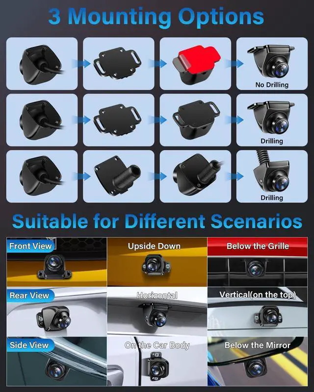 Adjustable Backup Camera DesignRear view camera can adjust 360°+45° rotation angle up/down/left/right, easy to get the best view angle, break through the traditional barriers of a single fixed camera angle and gaskets to adjust the angle, it can be used as a front camera/rear camera/side camera. Diversified Mounting MethodsYou can choose between drilled or un-drilled mounting options, can be used in multiple mounting scenarios.