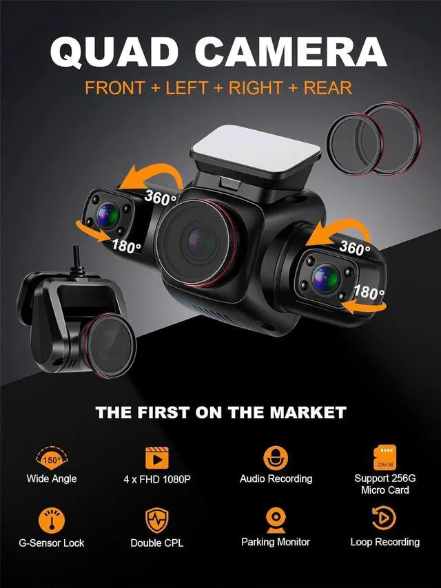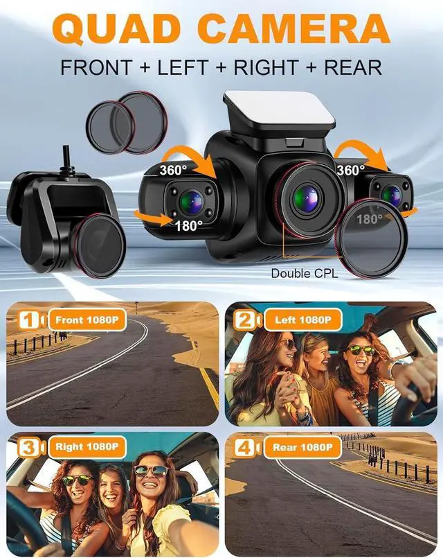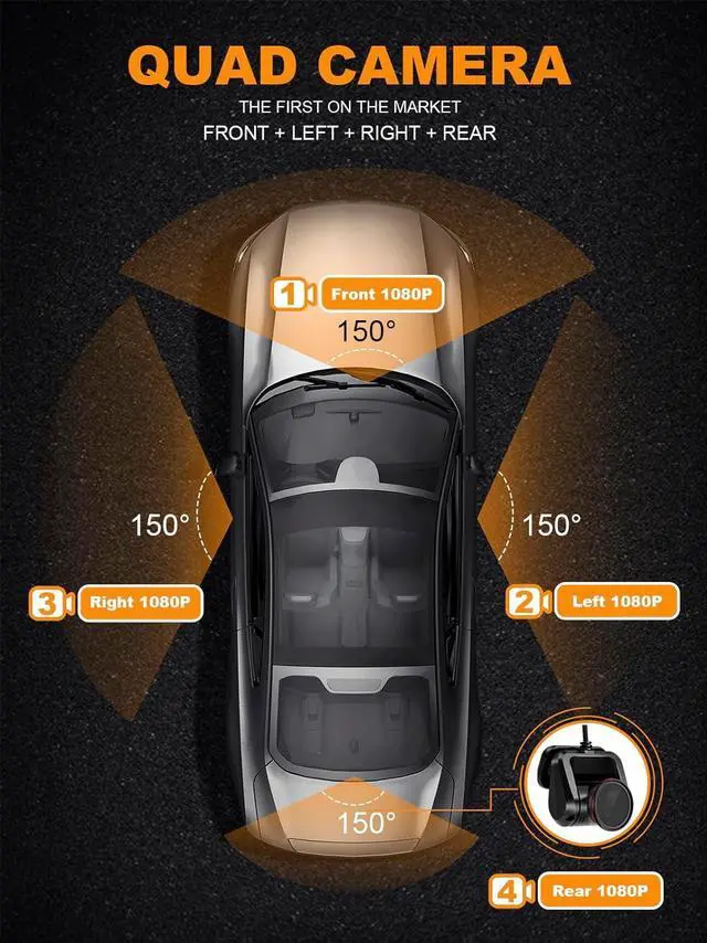 [4 Channel Front and Rear and Inside Dash Cam] The quad FHD 1920*1080P dash cam's 150-degree super wide-angle lens and 2 inches huge LCD screen gives sharper movies and images even when traveling at high speeds, and allow you to re-watch important moments. The first dash cam can simultaneously record the front and sides of the vehicle and the two cabin cameras can freely change the recording angles and rotate left and right allowing you to record in opposite directions as well.