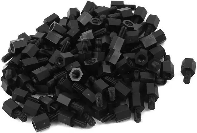 Screw threaded hexagon?stand-off spacers of?male to female type, with black nylon construction.