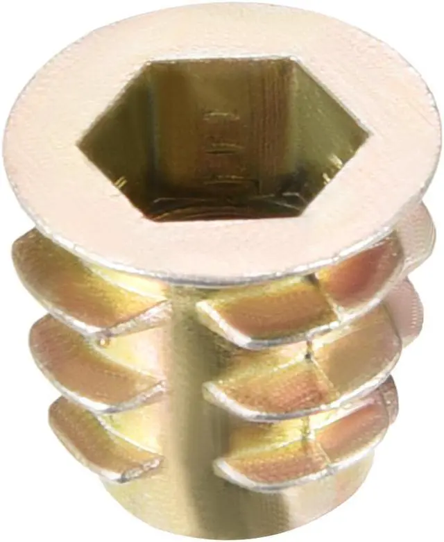 2.Ideal for use in materials such as pine, plywood, composition board, and MDF, Hex Drive inserts feature tapered external threads which resist pull out caused by vibration.