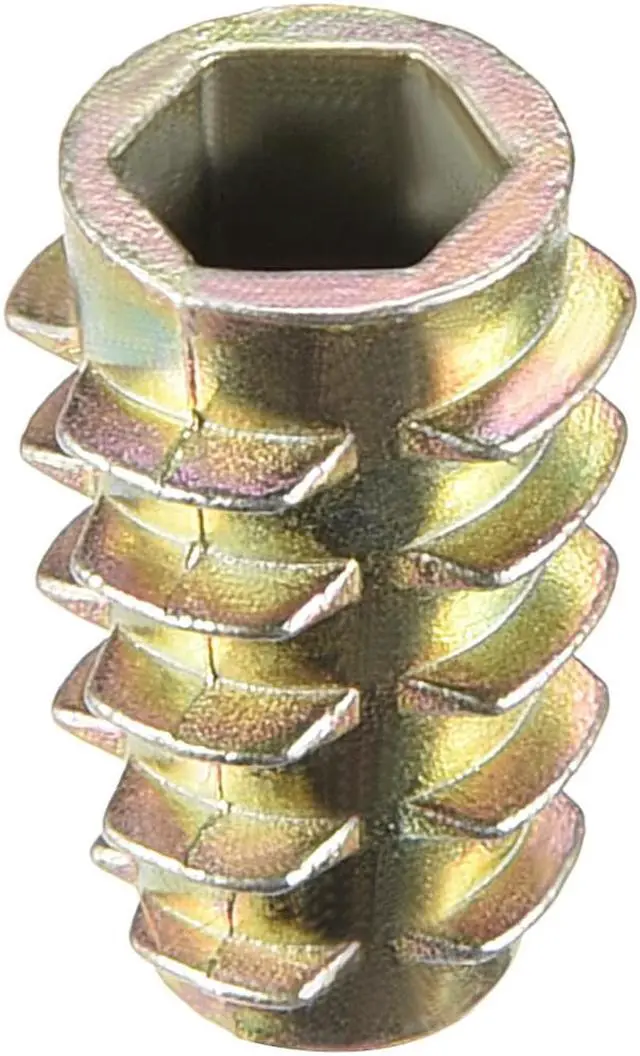 2.Ideal for use in materials such as pine, plywood, composition board, and MDF, Hex Drive inserts feature tapered external threads which resist pull out caused by vibration.