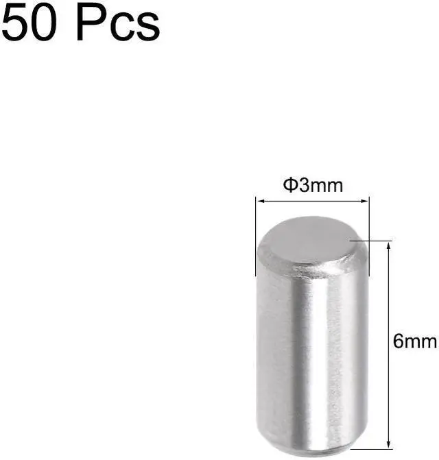 Steel dowel pins is 3 mm/ 0.12 inch in diameter and 6 mm/ 0.24 inch in height; Steel dowel pins color is in silver tone, 50 pieces.