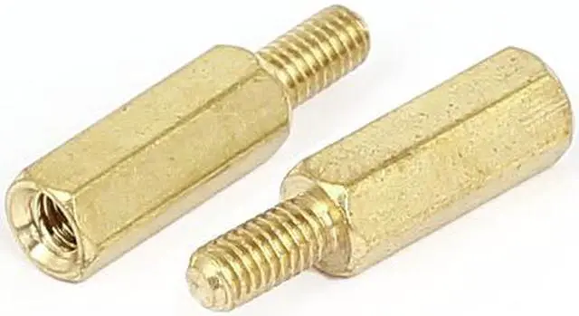 Screw threaded?hexagonal stand-off spacers of?male-female type, with brass?tone plated brass construction. Hexagonal threaded spacers are ideal for mounting between PCB circuit boards and machine boards.