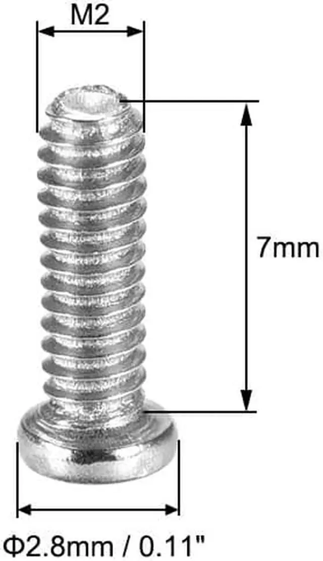 Description:Carburization + nickel plated screw are corrosion resistant, durable.Cross slot, uniform force,easy to lock, not easy to slip, more convenient and quick to use.Laptop Notebook Computer Screw can be used for IBM HP Mac Dell Lenovo SAMSUNG Sony Gateway LG and other universal laptop.It is very convenient to repair the Laptop, Notebook, Netbook and Home appliance or Office device.Specification:Material: Carbon SteelFinish: Carburization + Nickel PlatedScrew Groove Type: PhillipsThread Size: M2 x 7mmThread Pitch: 0.4mm / 0.016"Screw Head Size: 2.8mm x 1.1mm / 0.11" x 0.04"(D*T)Main Color: Silver TonePackage Content:50pcs x Computer Screws