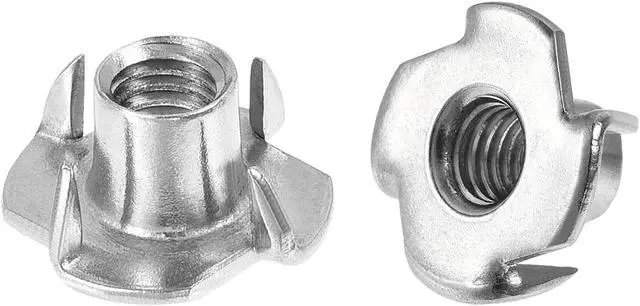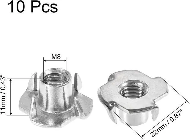 Description:1.Usage: Very suitable for solid wood products, plywood, particleboard, to play a very strong connection role. Commonly used in fixed cabinets, table and chair legs, leather bags, etc.2.Advantages: It is made of 304 stainless steel, precision threaded by machining, heat treatment strengthening process, passivation surface, corrosion resistance and high strength. The 4 anti-claws are deeply inserted into the locked object, which is not easy to loosen, supporting all your projects.3.How to use: First make a hole according to the outer diameter of the rod, insert the outer rod of the pronged tee nut into the hole, hit the bottom of the nut flange with a hammer, let the 4 claws be inserted into the wood, and a stable and firm nut connection is realized.4.Note: 1. Do not directly tap the thread to avoid making the thread unusable. 2. According to the size of the connected load, select the corresponding t-nut to match to avoid falling off due to excessive load.Specification:Product Name: Tee NutMain Color: Silver ToneMaterial: 304 Stainless SteelFinish: PassivationThread Size: M8Height: 11mm / 0.43"Flange Diameter: 22mm / 0.87"Barrel Outer Diameter: 9.6mm / 0.38"Panel Thickness: 1.5mmPackage Content:10pcs x Tee Nut