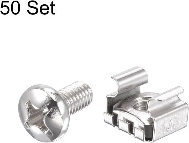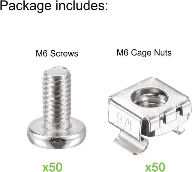 platedPackage includes: 50set M6 Rack Mount Cage Nuts & Screws (50pcs cage nuts, 50pcs screws).