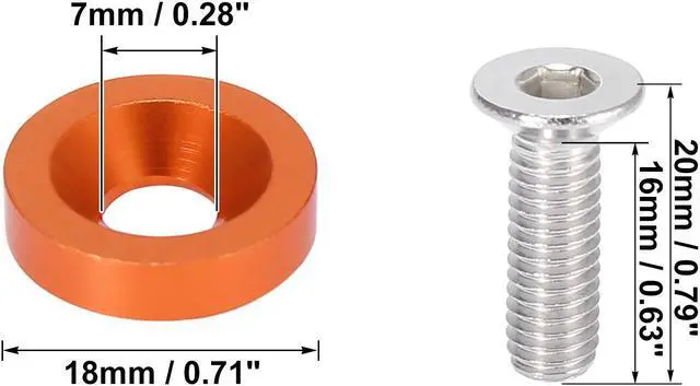Washer Size: 7x18mm/ 0.28"x0.71" (ID*OD); Bolt Size: M6x1.0; Bolt Stem Length: 16mm/0.63"; Bolt Total Length: 20mm/0.79". Please confirm the size carefully before ordering.