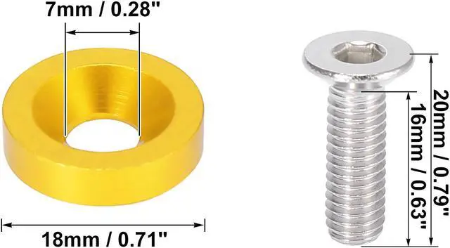Washer Size: 7x18mm/ 0.28"x0.71" (ID*OD); Bolt Size: M6x1.0; Bolt Stem Length: 16mm/0.63"; Bolt Total Length: 20mm/0.79". Please confirm the size carefully before ordering.