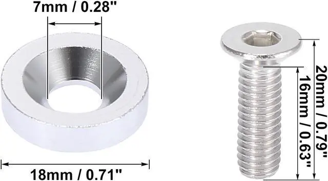 Washer Size: 7x18mm/ 0.28"x0.71" (ID*OD); Bolt Size: M6x1.0; Bolt Stem Length: 16mm/0.63"; Bolt Total Length: 20mm/0.79". Please confirm the size carefully before ordering.