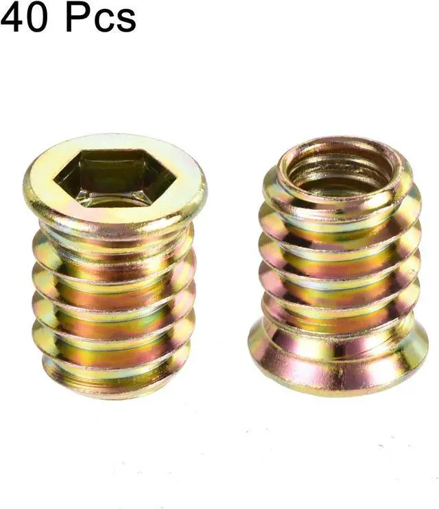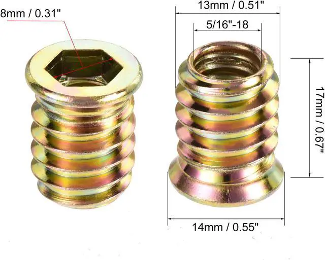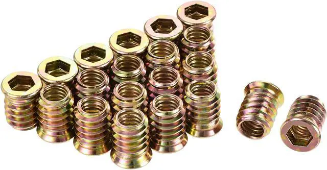 Description: 1. Made of carbon steel, color galvanized surface treatment, high hardness, and perfect wear resistance, inner hexagon socket, smooth, non-slip. 2. Suitable for hardwood, such as solid wood, has a good effect on the furniture combination. 3. The unique external thread ensures positive locking and offers strong resistance against pull-out due to torsion or vibration. 4. Make a hole smaller than the outer diameter of 0.2 - 0.5 mm and lock the nut with a hex wrench. The mounting hole should not be larger than the outer diameter of the thread. When the nut is locked, some wood glue can be applied to the outer teeth to make the fastening effect good.