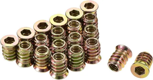 Description: 1. Made of carbon steel, color galvanized surface treatment, high hardness, and perfect wear resistance, inner hexagon socket, smooth, non-slip. 2. Suitable for hardwood, such as solid wood, has a good effect on the furniture combination. 3. The unique external thread ensures positive locking and offers strong resistance against pull-out due to torsion or vibration. 4. Make a hole smaller than the outer diameter of 0.2 - 0.5 mm and lock the nut with a hex wrench. The mounting hole should not be larger than the outer diameter of the thread. When the nut is locked, some wood glue can be applied to the outer teeth to make the fastening effect good.