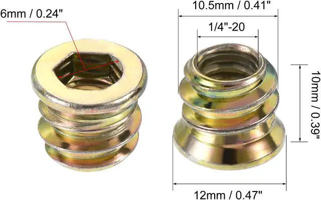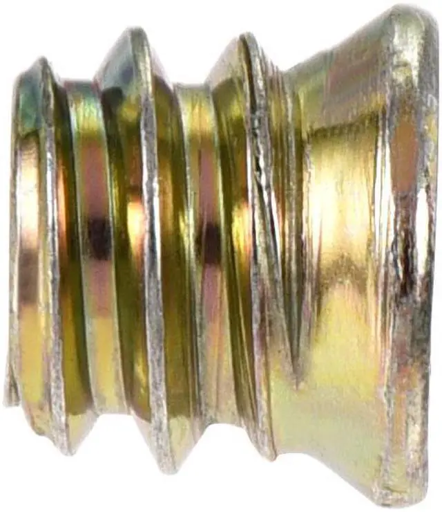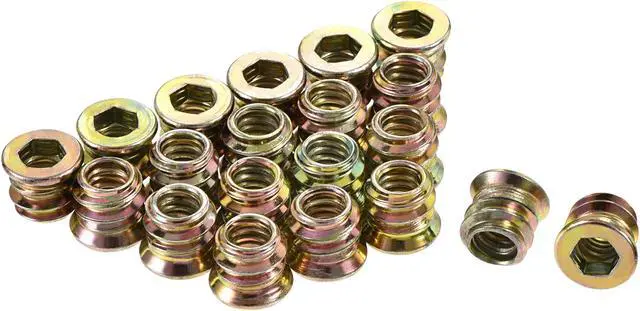 Description: 1. Made of carbon steel, color galvanized surface treatment, high hardness, and perfect wear resistance, inner hexagon socket, smooth, non-slip. 2. Suitable for hardwood, such as solid wood, has a good effect on the furniture combination. 3. The unique external thread ensures positive locking and offers strong resistance against pull-out due to torsion or vibration. 4. Make a hole smaller than the outer diameter of 0.2 - 0.5 mm and lock the nut with a hex wrench. The mounting hole should not be larger than the outer diameter of the thread. When the nut is locked, some wood glue can be applied to the outer teeth to make the fastening effect good.