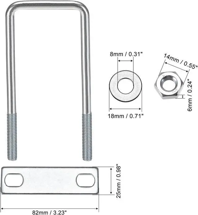 Description:1.Carbon Steel contructed with gread performance in antirust and corrosion resistance.2.Used to fix or connect the locked parts to pipes, wood, etc. Suitable for cars, boats, plumbing, and other home and industrial applications.Specification:Product Name: U-BoltMaterial: Carbon SteelMain Color: Silver ToneThread Dia.: M8Fit Square Rod Size: 50mm / 1.97"Rod Diameter: 7mm / 0.28"Total Length: 150mm / 5.9"Hex Nut Size: 14 x 6mm / 0.55" x 0.24"(Hex Width*H)Frame Plate Size: 82 x 25 x 3mm / 2.76" x 0.98" x 0.1"(L*W*T)Round Washers Size: 18 x 8 x 1mm / 0.71" x 0.31" x 0.04"(OD*ID*T)Package Content:2 x U-Bolt, 4 x Nuts, 4 x Round Washers, 2 x Plates