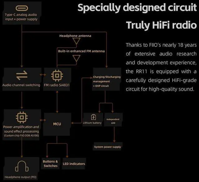 The FiiO RR11 features a super-slim body of 13mm thickness with dimensions of just 83.2mmx39.4mmx 13mm, similar to a lighter. The knob is made of aluminum alloy, truly blending retro and modern. This pocket-sized radio is for those who resonate with sound waves.