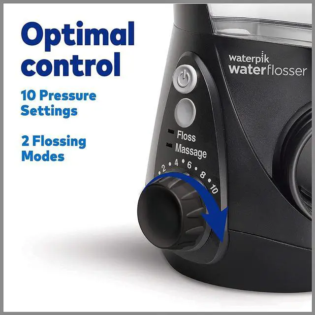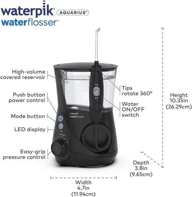 ADVANCED WATER FLOSSING: Aquarius is a performance water flosser model featuring enhanced pressure with 10 settings for a custom clean, massage mode for gum stimulation, plus a built-in timer/pacer pauses briefly at 30 secs and 1 min to help track flossing time.
