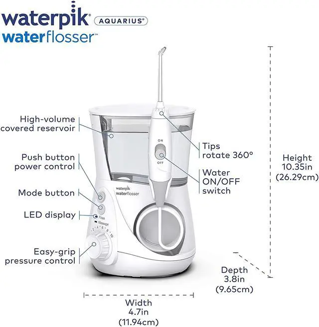 ADVANCED WATER FLOSSING: Aquarius is a performance water flosser model featuring enhanced pressure with 10 settings for a custom clean, massage mode for gum stimulation, plus a built-in timer/pacer pauses briefly at 30 secs and 1 min to help track flossing time.