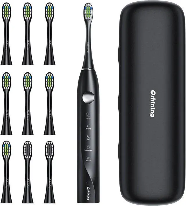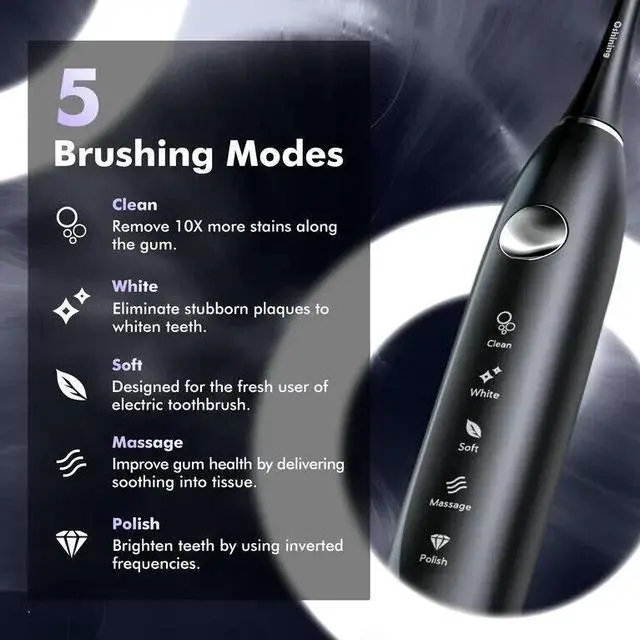 5 High-performance Modes: Electric toothbrush for adults supports 5 modes based on your specific needs: Whitening, Cleaning, Soft, Polishing, and Massage. Whitening mode vibrates 40, 000 strokes per minute to break the stains. Clean mode goes deep into the inter dental, removes the dirt hidden in the periodontal. While massage mode offers a gentle massage of gums.