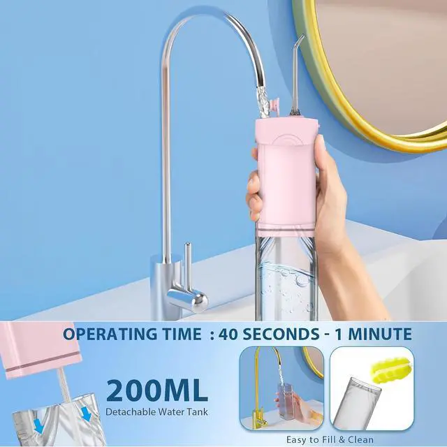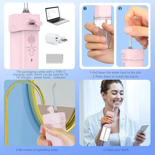 This rechargeable portable water flosser features a 200ml telescopic water tank and five adjustable jet tips, offering customizable pressure modes suited for sensitive gums, orthodontics, and daily oral hygiene. The 360° swivel nozzle reaches hard-to-access areas while a built-in tip carousel keeps accessories neat and germ-free. Rated IPX7 waterproof, its safe for shower use or rinsing under water. Small, USB-powered, and cordless, its perfect for both travel and at-home use. The sleek pink ABS design is not only visually appealing but also durable and compact, ideal for modern lifestyles.